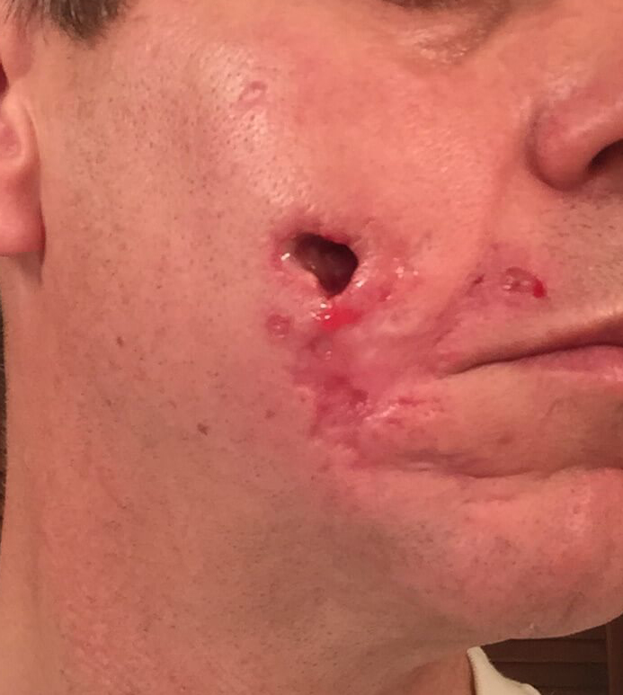 Image 15: Same patient. Deep lesions continue forming on the right side of his face.