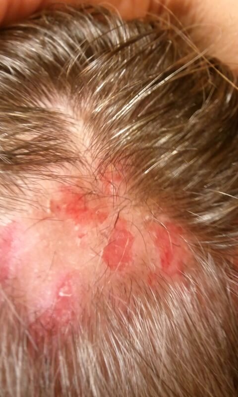 Image 3: Lesions on scalp with hair loss.