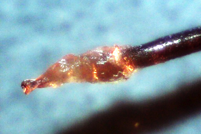 Image 46: Dog whisker with gelatinous material at the root, similar to what is seen in humans with MD. Photo courtesy of Lee M. Laskowsky.