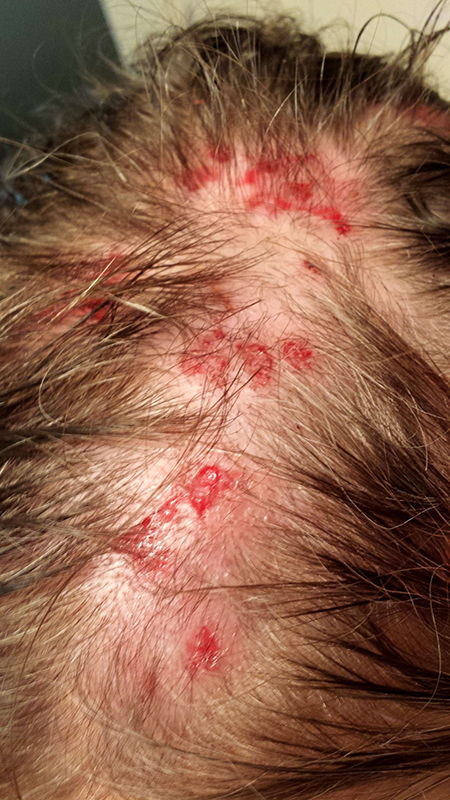 Image 3: Lesions on scalp with hair loss.