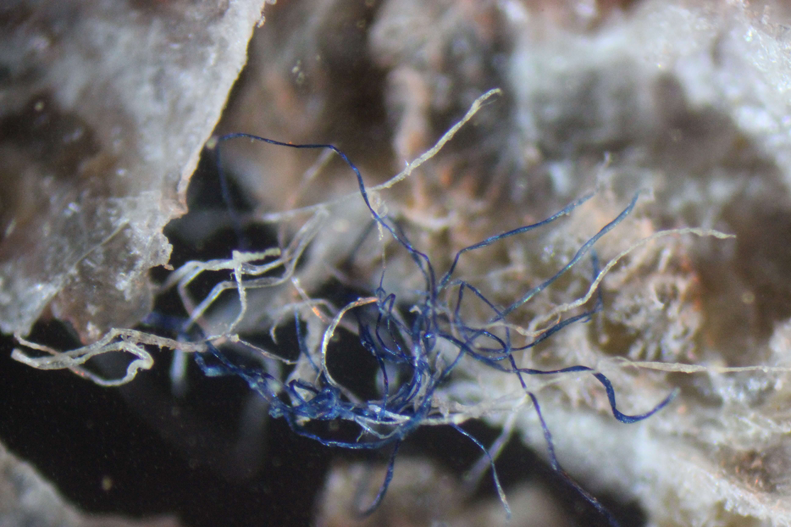 Image 4: Blue and white filaments seen intertwined in a scab.