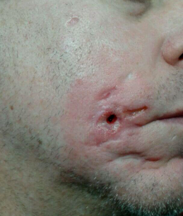 Image 15: Same patient. Deep lesions continue forming on the right side of his face.