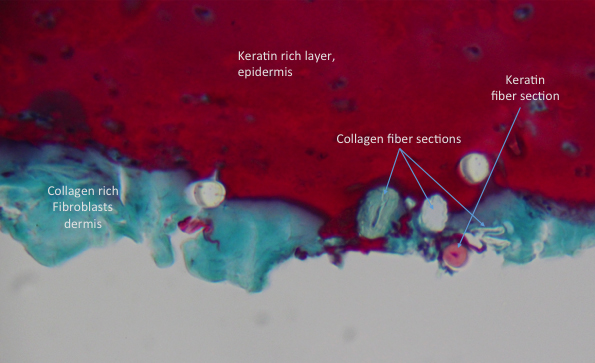 turns keratin red and collagen a bluish-green.